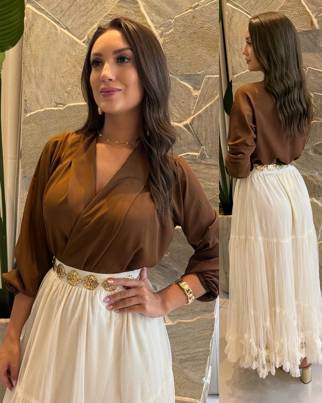 Blusa Manga Longa Chiffon Lucia Marrom