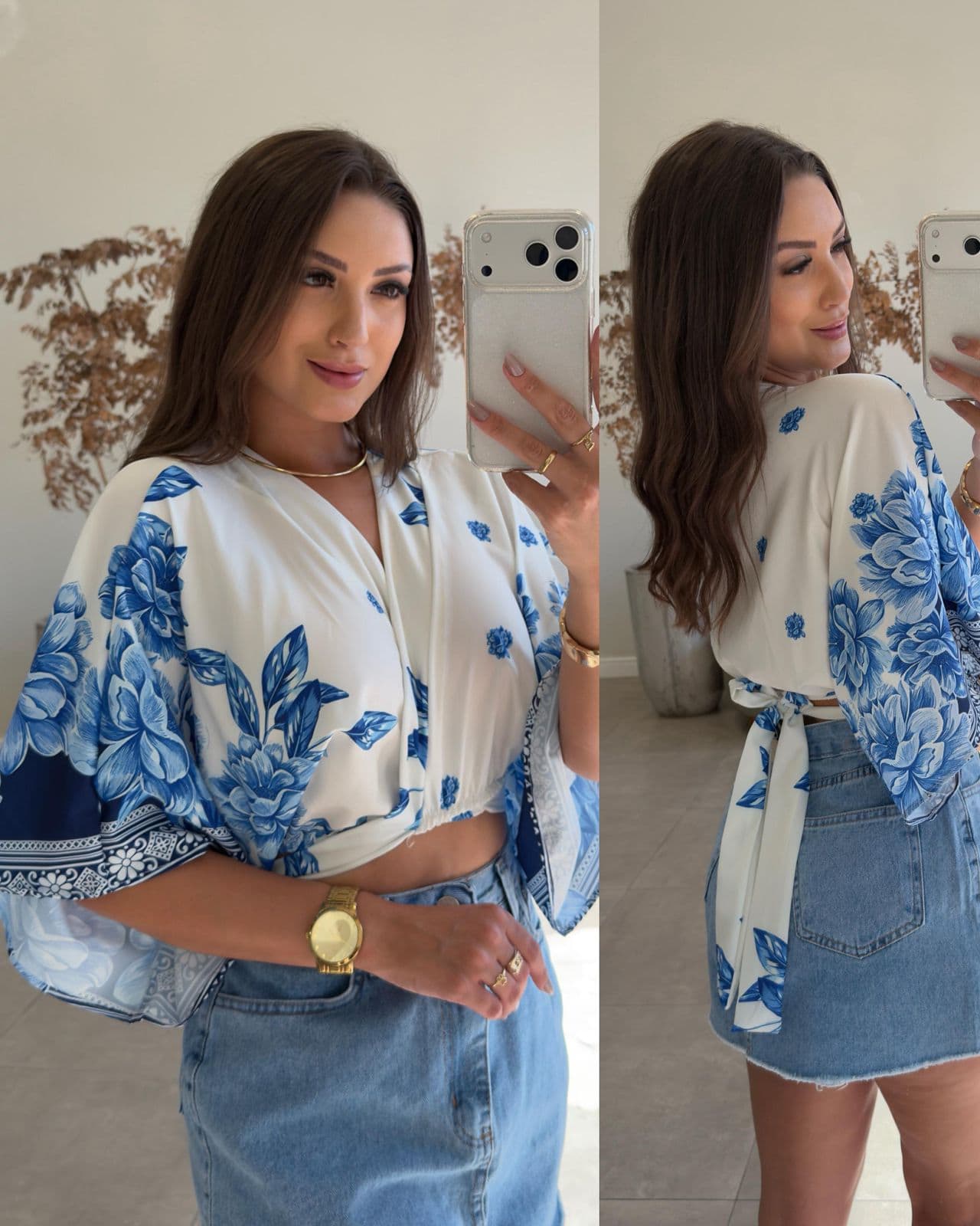 66 cm de busto, 54 cm de cintura, 28 cm de manga e 25 cm de comprimento