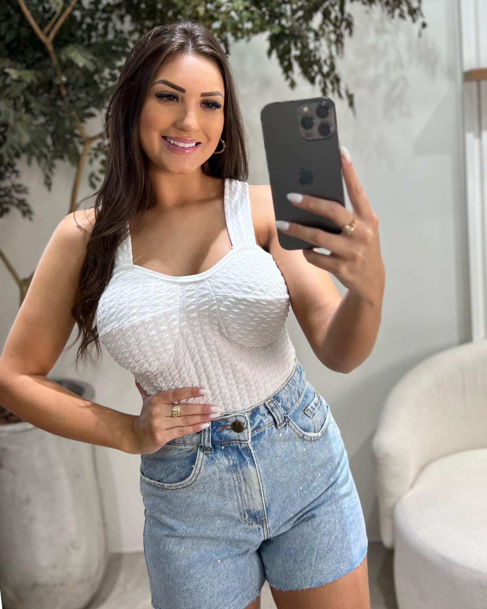 70 cm de busto, 64 cm de cintura e 67 cm de comprimento.