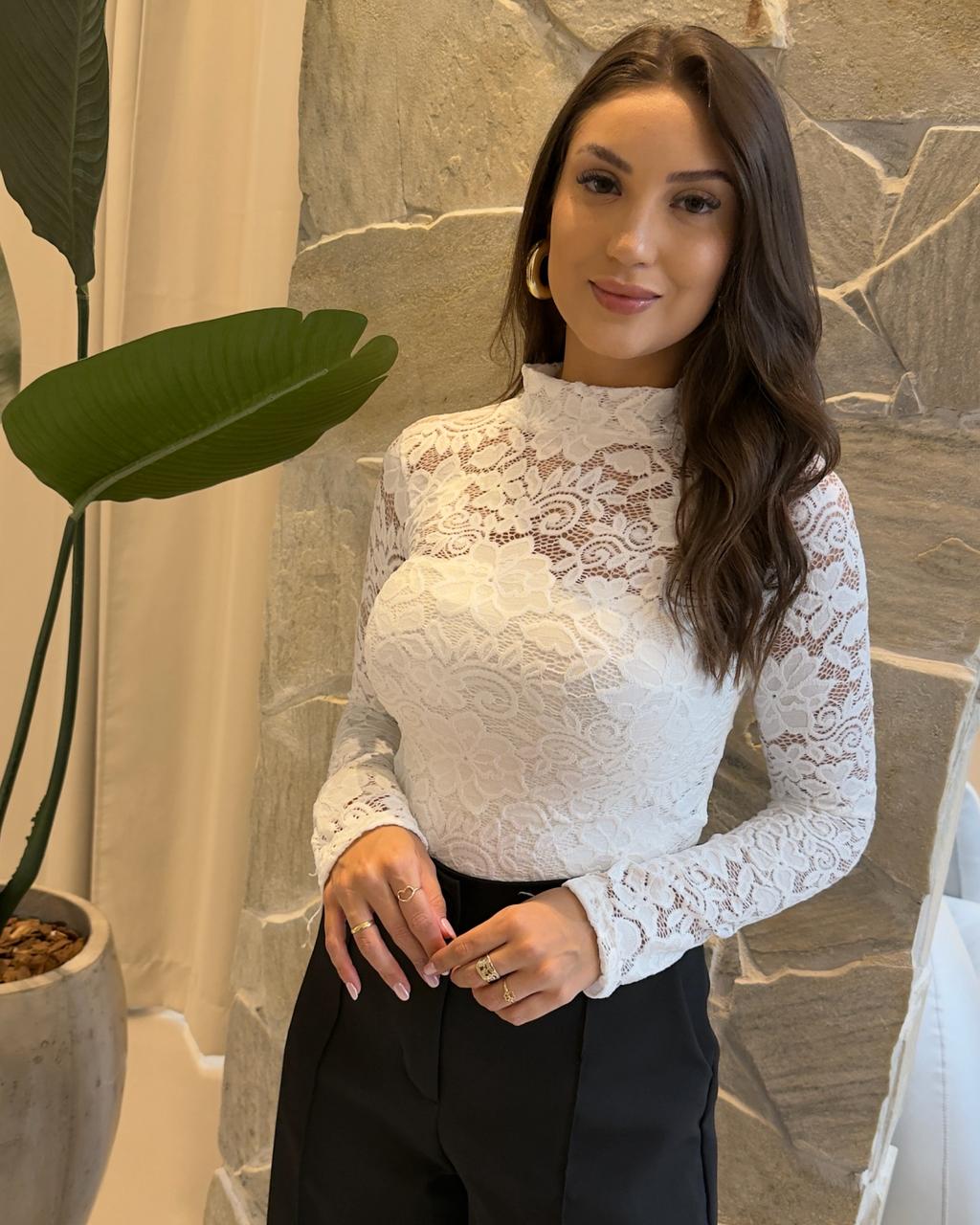 60 cm de busto, 64 cm de cintura, 58 cm de manga e 75 cm de comprimento.
