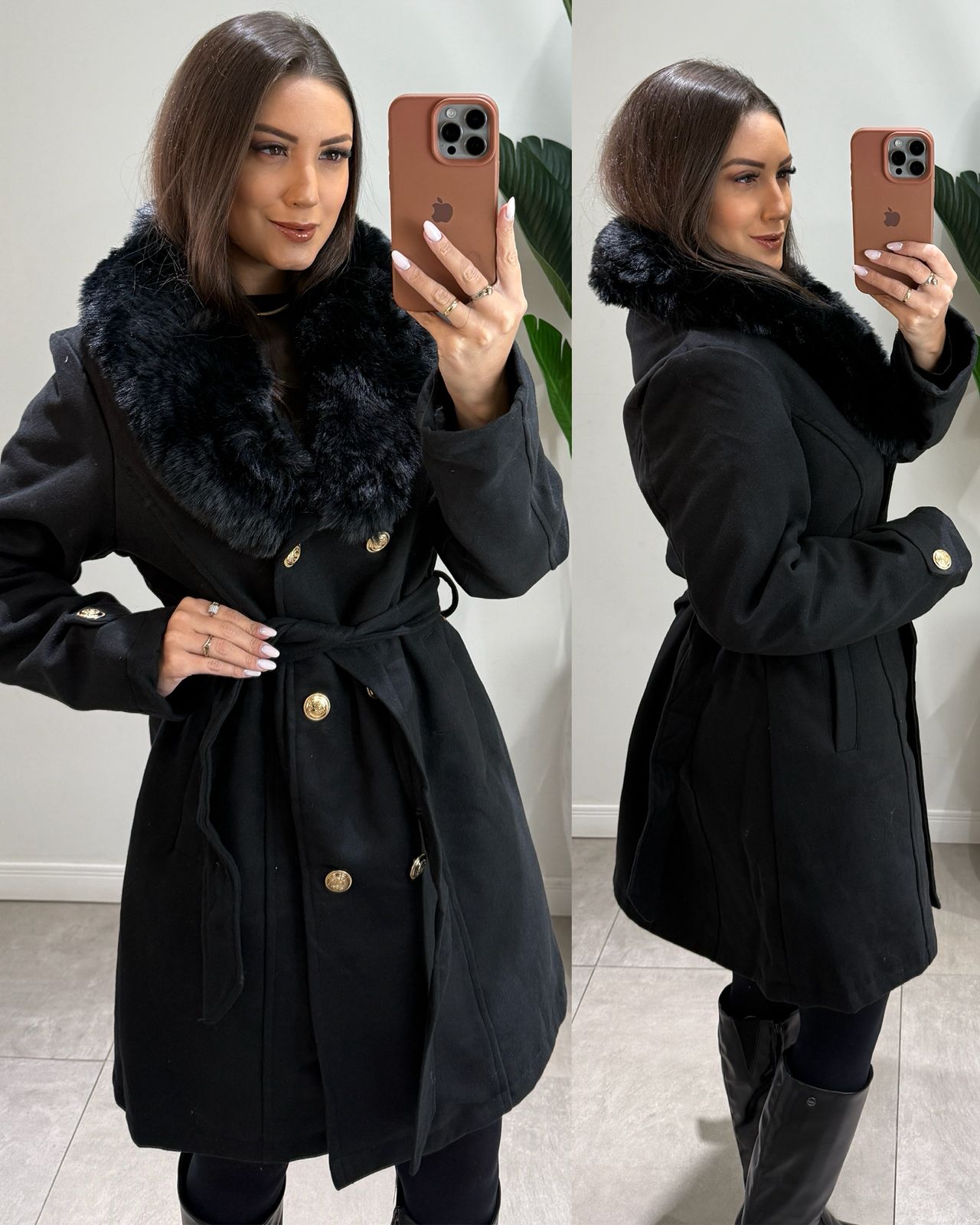 P – 104 cm de busto, 104 cm de cintura, 51 cm de manga e 94 cm de comprimento.