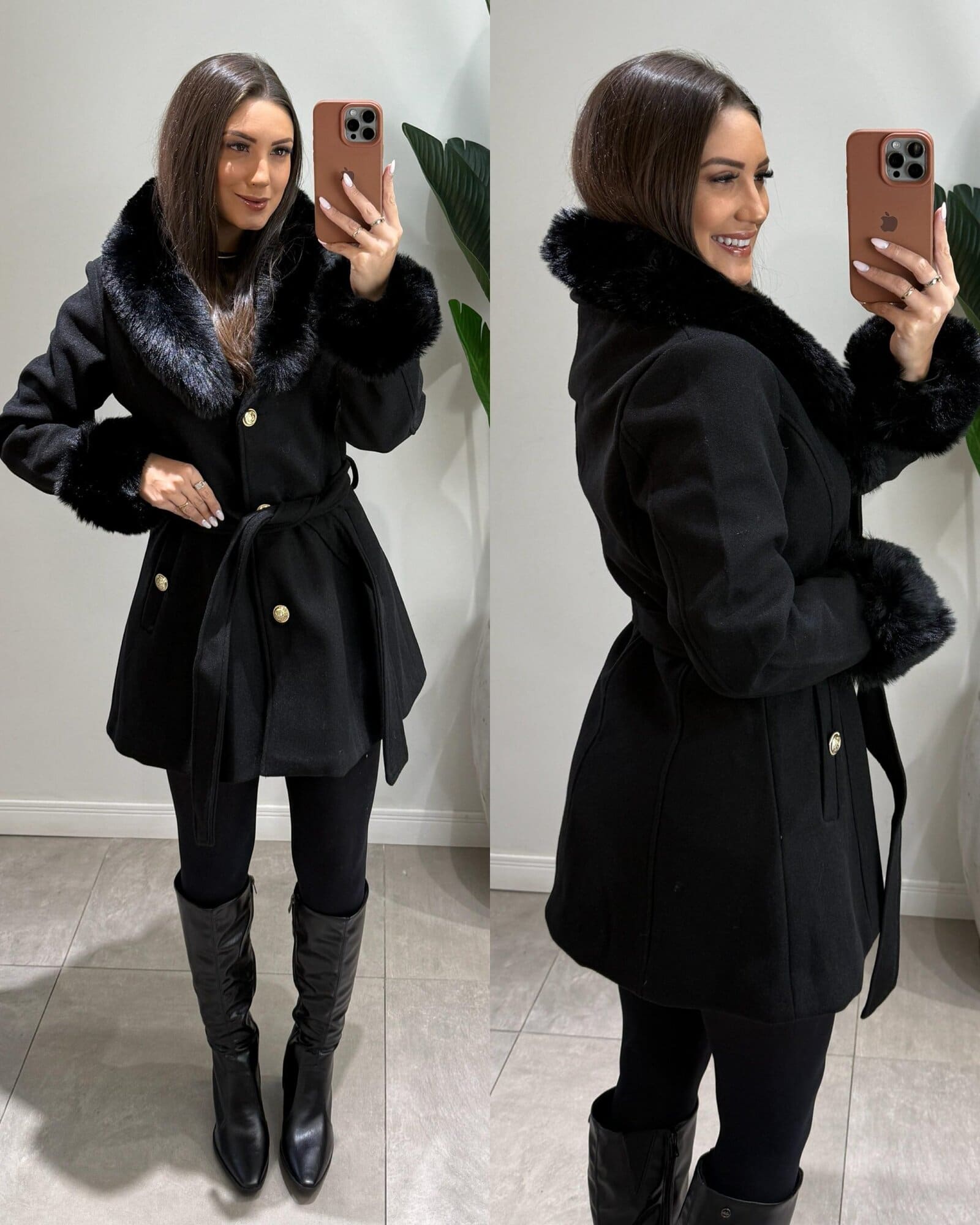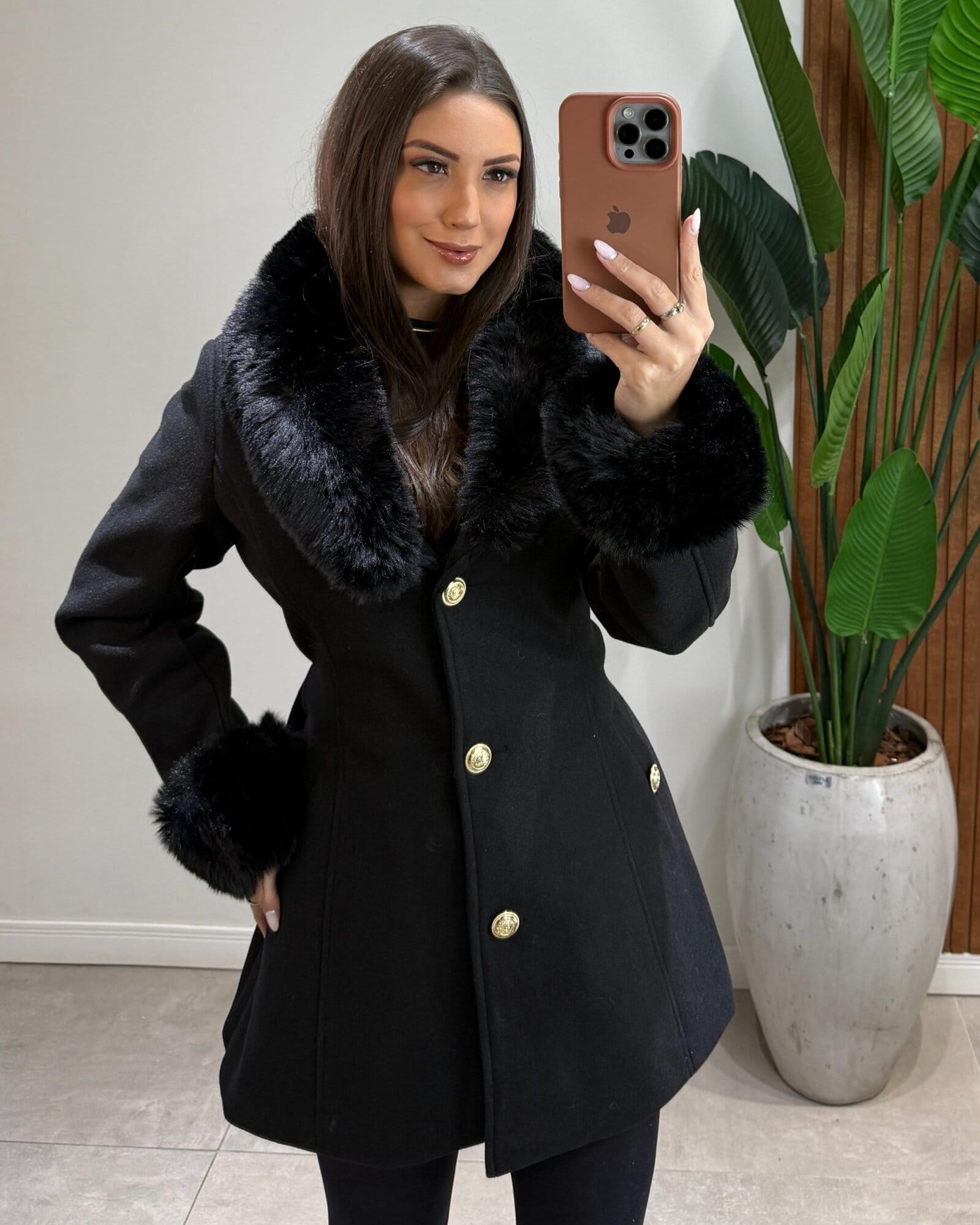P – 104 cm de busto, 104 cm de cintura, 51 cm de manga e 94 cm de comprimento.