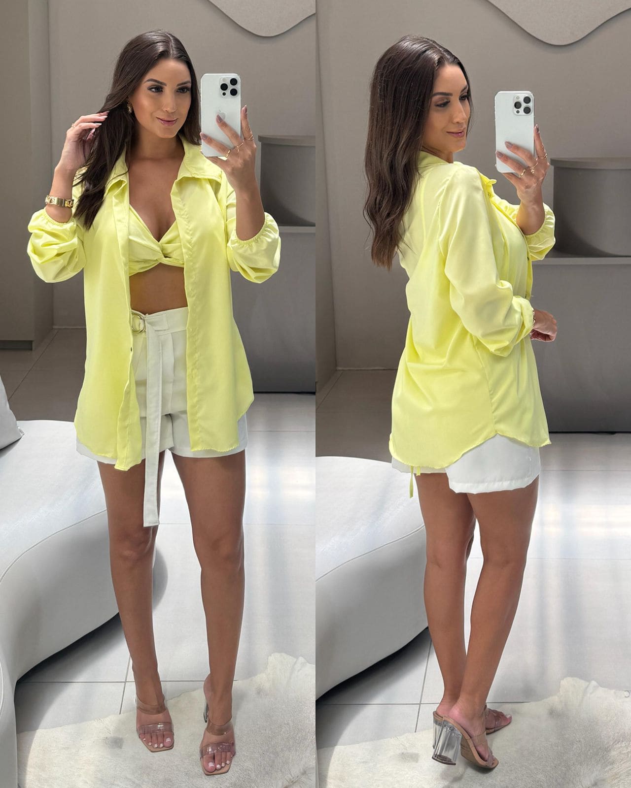Camisa- 72 cm de busto, 94 cm de cintura, 55 cm de manga e 73 cm de comprimento