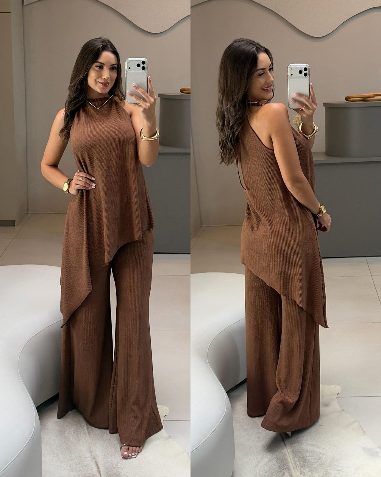 Calça: 64 cm de cintura, 92 cm de quadril e 110 cm de comprimento.