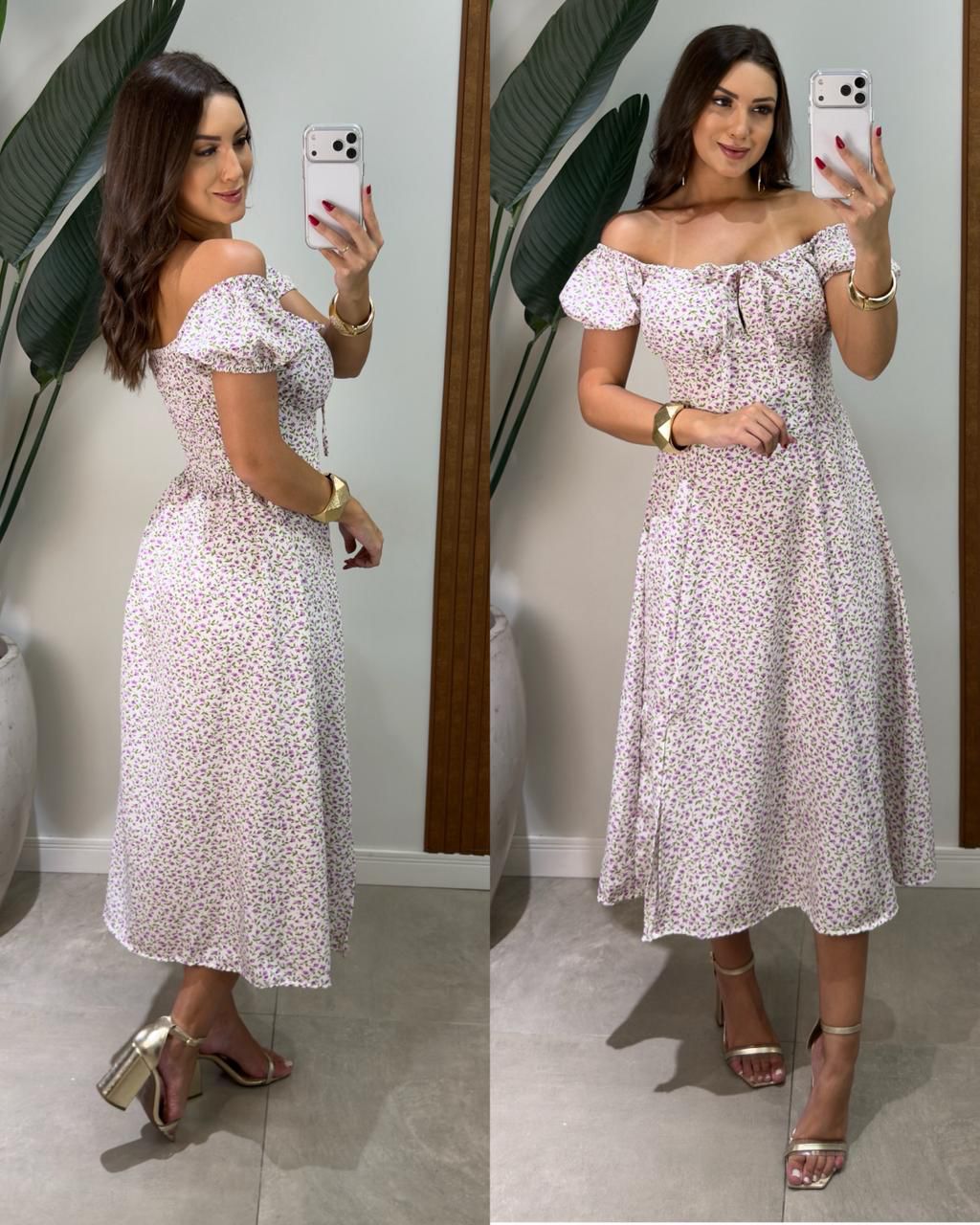 64 cm de busto, 66 cm de cintura, 77 cm de quadril e 103 cm de comprimento.