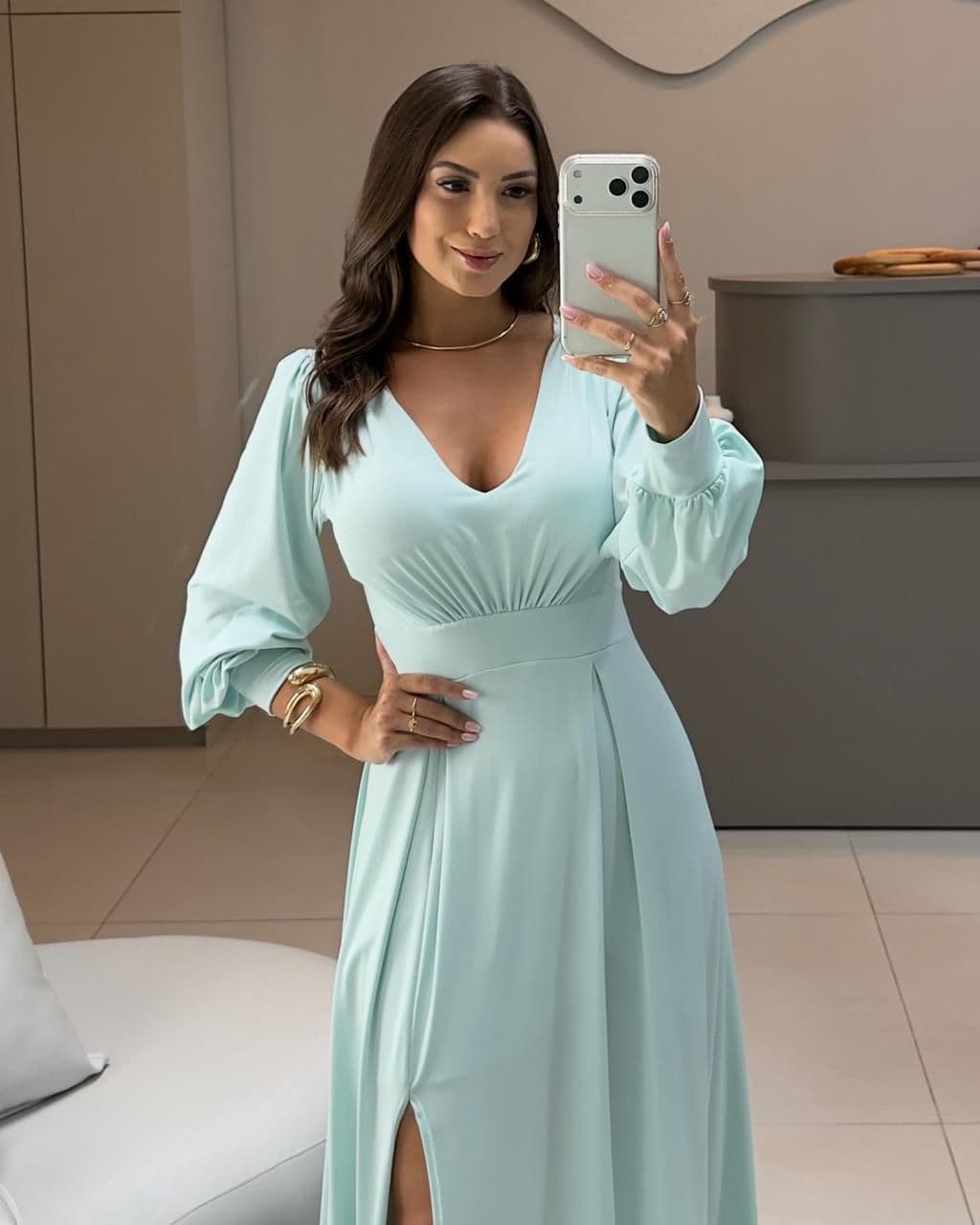 66 cm de busto, 64 cm de cintura, 72 cm de quadril, 60 cm de manga e 149 cm de comprimento.