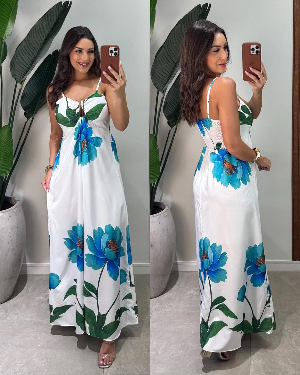 59 cm de busto, 62 cm de cintura, 77 cm de quadril e 124 cm de comprimento.