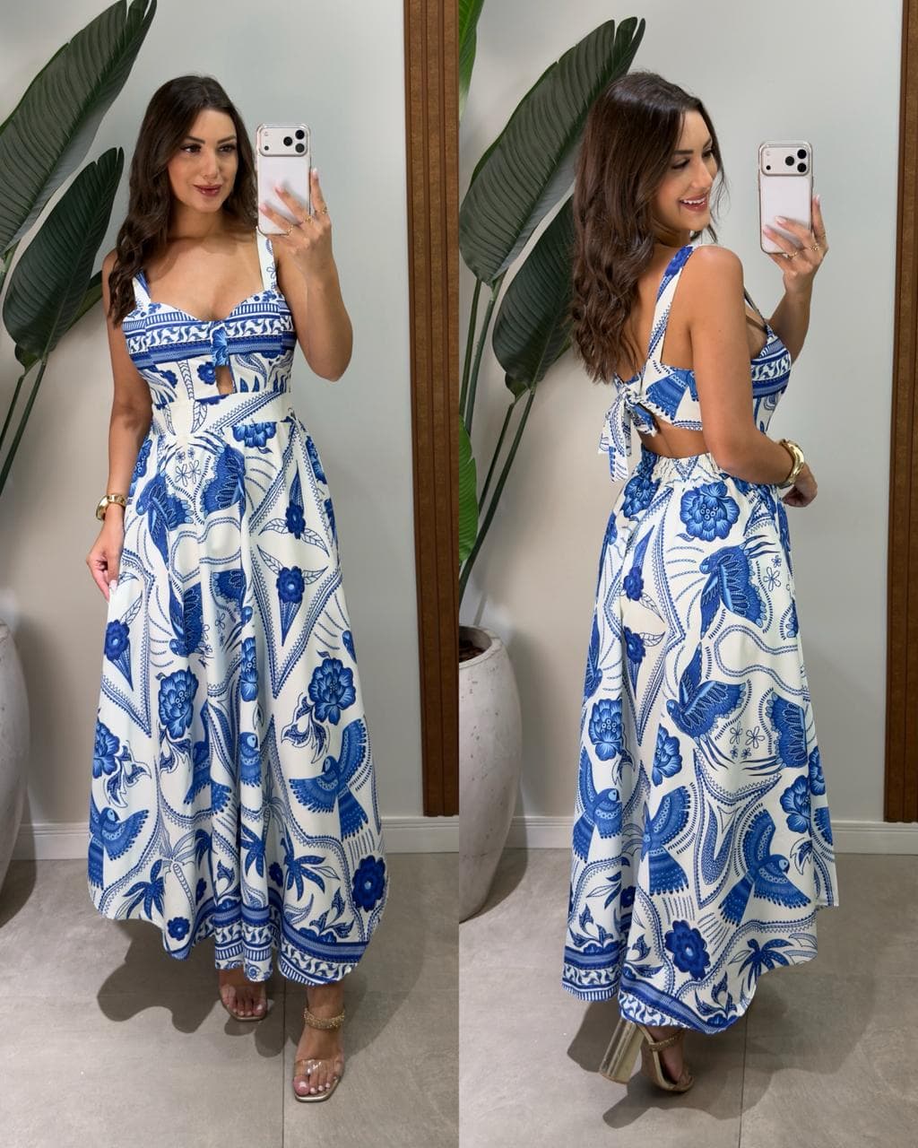 64 cm de busto, 66 cm de cintura, 82 cm de quadril e 104 cm de comprimento.