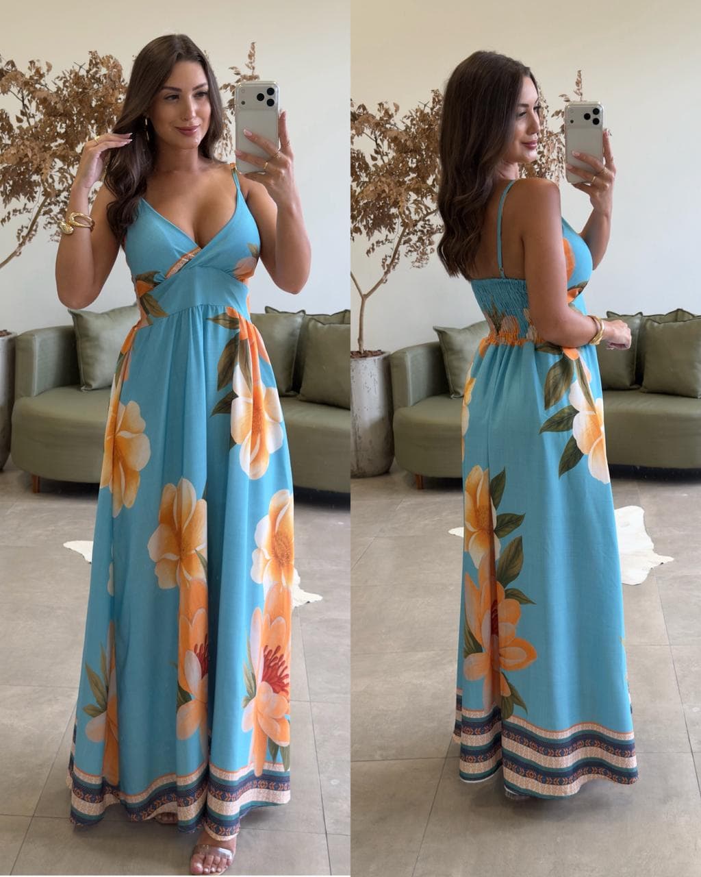 66 cm de busto, 78 cm de cintura, 98 cm de quadril e 122 cm de comprimento.