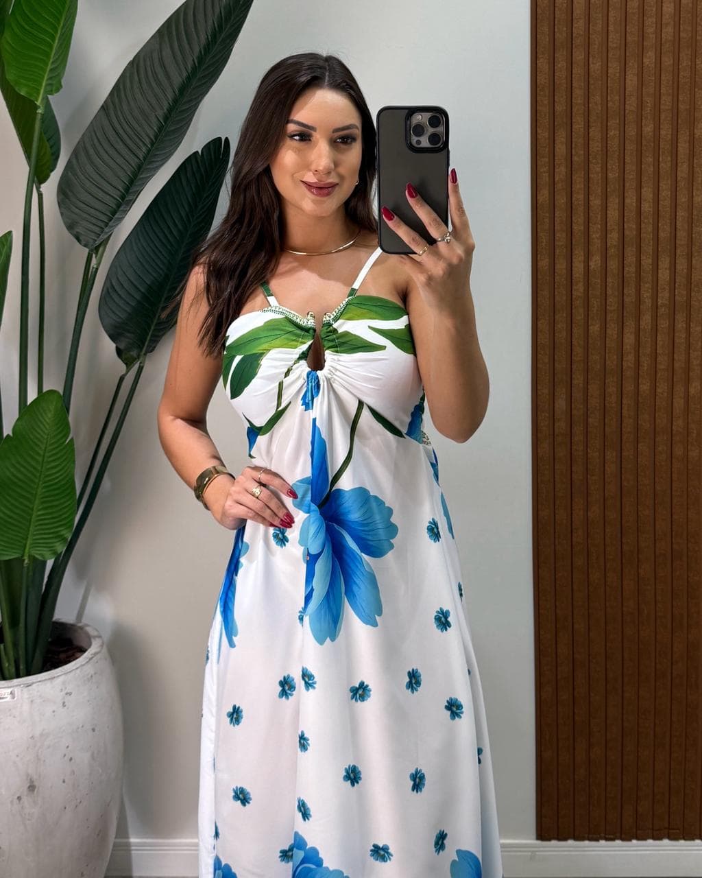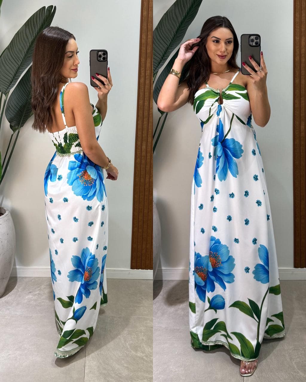 62 cm de busto, 68 cm de cintura, 82 cm de quadril e 129 cm de comprimento.