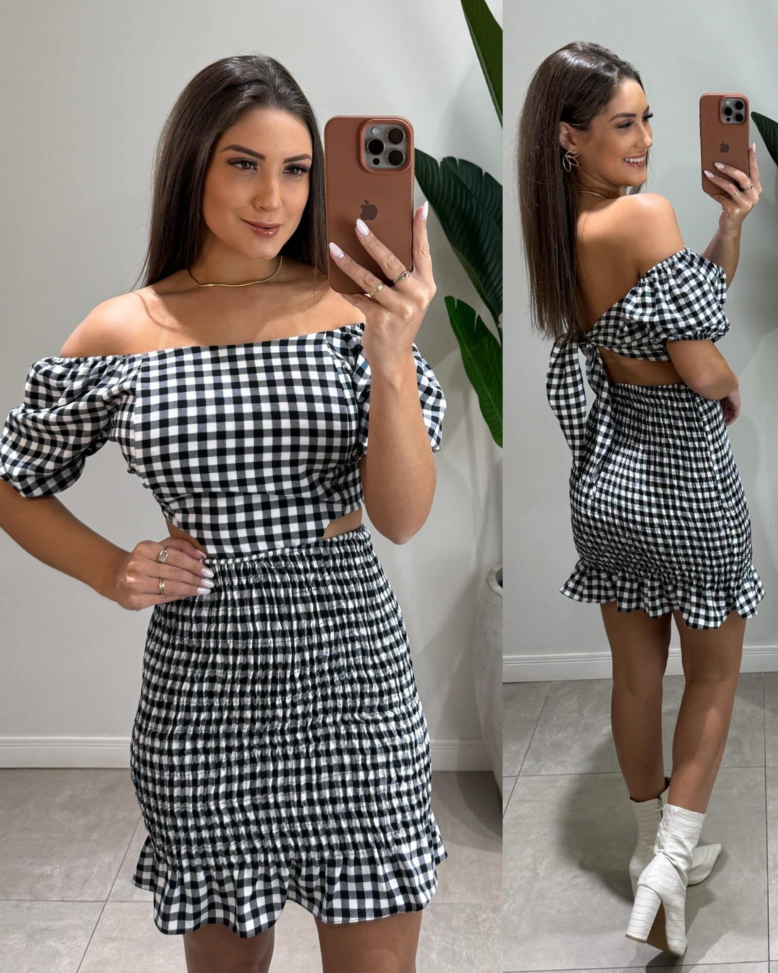 98 cm de busto, 60 cm de cintura, 60 cm de quadril, 32 cm de manga e 75 cm de comprimento.